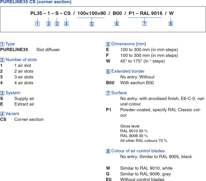 Order example: PL35-2- -CS/150x250x45/B00/P1-RAL 9016/W