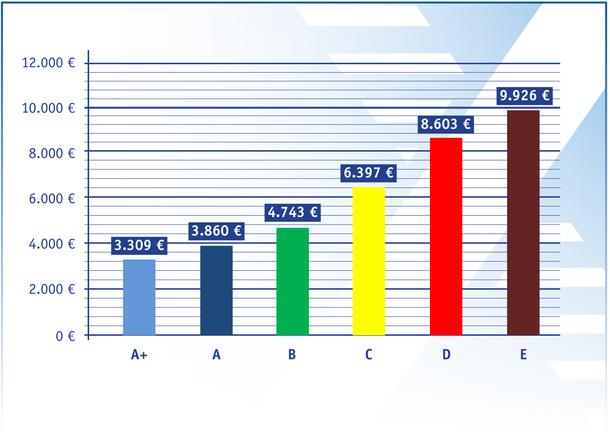 Within the period of one year, one pocket filter of filter class F7 according to EN779, using a volume flow rate of 100,000 m³/h, consumes EUR 8603.00 in energy efficiency class D and EUR 3309.00 in energy efficiency class A+. Changing the filters from energy efficiency class D to A+ results in an annual energy costs saving of 61% (EUR 5294.00).