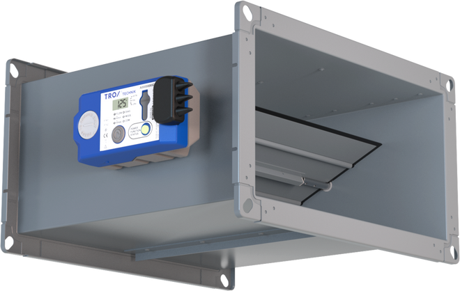 VAV terminal units in rectangular design for variable and constant volume flow systems, for supply air or extract air, in several nominal sizes. High control accuracy of set volume flow rates, even in unfavourable upstream conditions. Control range at least 1:10. Differential pressure measurement and control via damper blade. Tubeless differential pressure transmission through differential pressure duct in shaft Closed blade air leakage according to EN 1751: class 2 or 3 depending on nominal size. Casing air leakage according to EN 1751, class C Ready-to-commission unit which consists of the mechanical parts and the factory mounted electronic control component. Position of the damper blade indicated externally at the control component. The damper blade is factory set to open position, which allows a ventilation airflow even without control. Meets the hygiene requirements of EN 16798, Part 3, of VDI 6022, Sheet 1, and of DIN 1946, Part 4.
