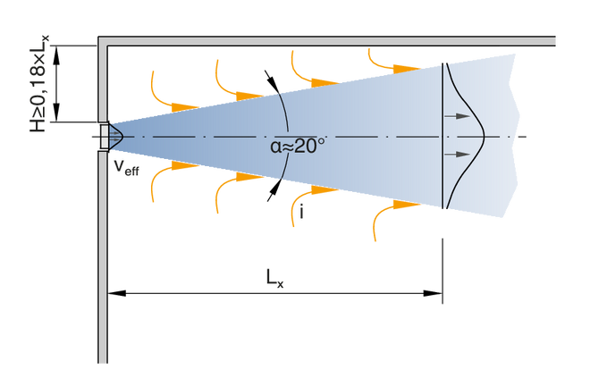Les grilles de ventilation sont des diffuseurs destinés au soufflage d'air et à la reprise des systèmes de ventilation et de climatisation. Ils orientent l'air soufflé vers la pièce. Les grilles de ventilation à ailettes réglables permettent d'adapter la direction de soufflage aux conditions locales. Il en résulte une ventilation à flux mélangé dans les zones de confort et les zones industrielles, avec une bonne ventilation globale de la pièce. En raison de l'induction, la vitesse du flux d'air soufflé diminue à mesure que l'on s'éloigne de la grille de diffusion. La distance à laquelle la vitesse du flux d'air atteint une valeur définie, comme par exemple 0,35 m/s, est appelée « portée ». Le jet d'air de soufflage qui provient des grilles murales disposées près du plafond atteint une portée supérieure à un jet libre comparable (sans l'effet du plafond) en raison de l'effet du plafond. Les grilles individuelles et les rubans à grille permettent tous d'obtenir des portées différentes. En mode refroidissement, il est nécessaire de tenir compte de la déviation du jet vers la zone occupée, qui augmente dès que la différence de température entre l'air de soufflage et l'air ambiant augmente et que la vitesse de soufflage diminue. En mode chauffage, le jet d'air de soufflage est dévié vers le plafond. Cela n'a aucun effet nuisible sur la vitesse du flux d'air dans la zone occupée, mais peut affecter la ventilation complète de la pièce.