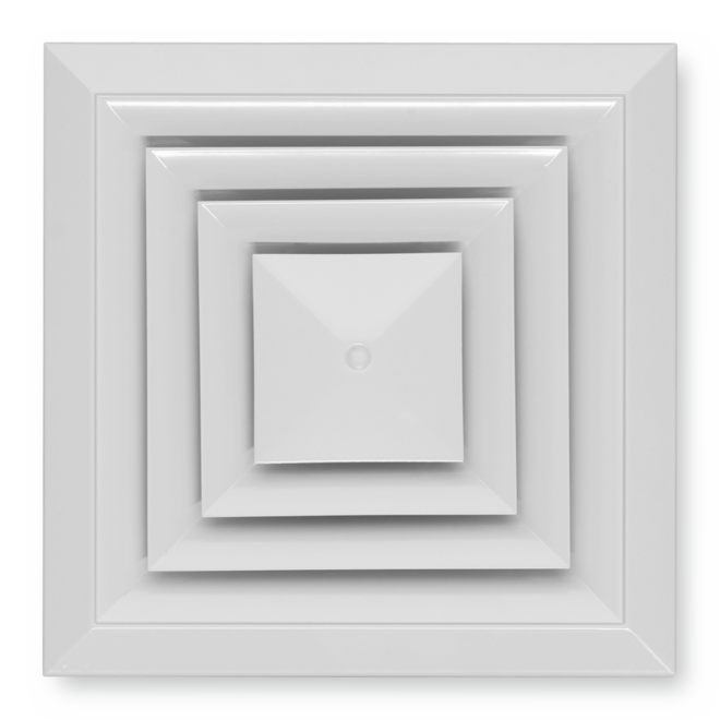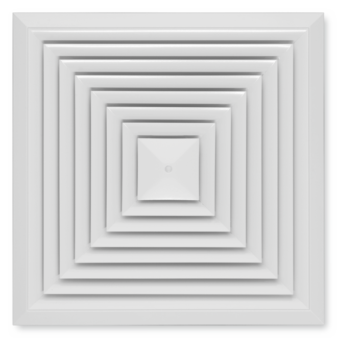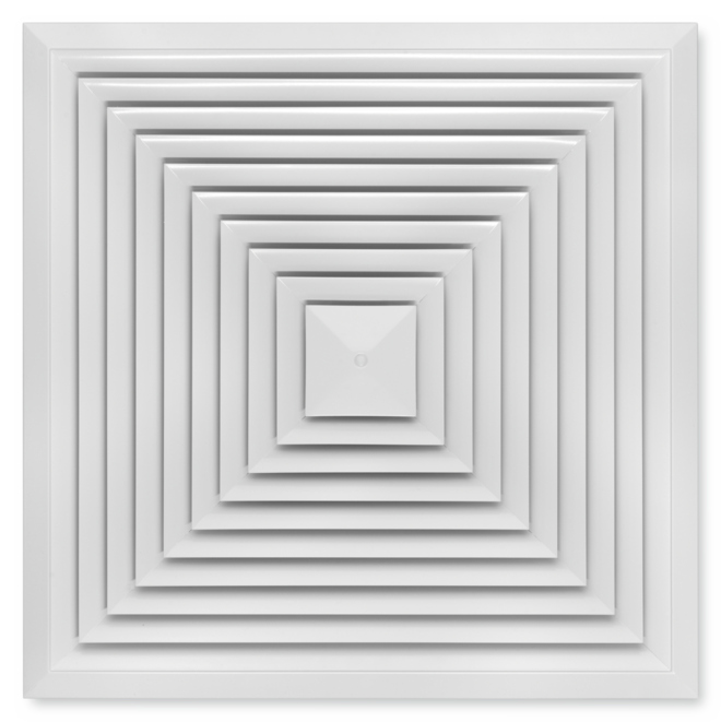 Plafondroosters met vierkant frontrooster. Als toevoer- of afvoerluchtrooster voor comfortinstallaties. Frontrooster met vaste lamellen voor horizontale vierzijdige luchtuitblaas. Voor inbouw in alle soorten verlaagde plafonds.