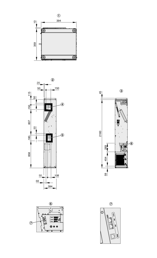 Ventilatie-unit met toevoer- en afvoerfunctie met omschakelmogelijkheid voor recirculatie (afhankelijk van luchtkwaliteit), met warmtewisselaar en warmteterugwinning voor verticale plaatsing tegen de borstwering.