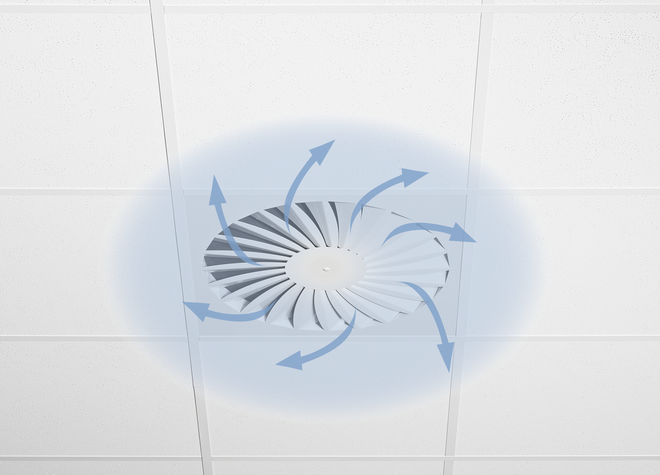 Wervelrooster met vierkant of rond frontrooster. Als toe- en afvoerrooster voor comfortinstallaties. Frontrooster met vaste lamellen voor wervelvormige horizontale luchtuitblaas met hoge inductie. Voor inbouw in alle soorten verlaagde plafonds.