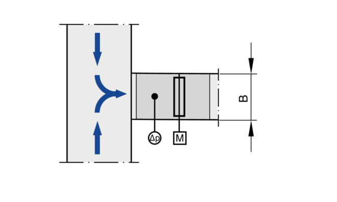 Le Δ de précision du débit s'applique à une section amont rectiligne de la gaine. Les coudes, les tés ou un rétrécissement ou un élargissement de la gaine génèrent des turbulences susceptibles d'affecter la mesure. Les raccordements en gaine, par ex. les ramifications quittant la gaine principale doivent être conformes à la norme EN 1505. Certaines situations de montage nécessitent des sections de gaine rectilignes en amont.